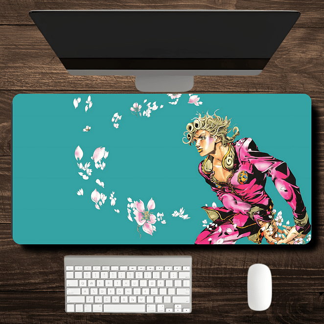 Mousepad Gamer con un elegante diseño inspirado en Giorno Giovanna, sobre un fondo turquesa con pétalos en movimiento que aportan dinamismo y estilo. Elaborado con materiales de alta calidad para máxima durabilidad. Su superficie cuenta con tecnología "Smooth Sliding", ideal para movimientos precisos. Disponible en tamaños 80x40 cm y 60x35 cm.