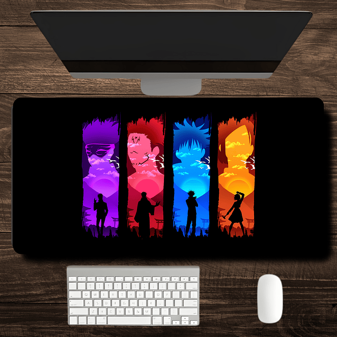 Mousepad Gamer con diseño artístico inspirado en Jujutsu Kaisen, que presenta siluetas de los personajes sobre un fondo degradado multicolor vibrante. Fabricado con materiales de alta calidad que aseguran durabilidad y confort. Tecnología “Smooth Sliding” para un deslizamiento preciso. Disponible en dos tamaños: 80x40 cm y 60x35 cm. Ideal para fans y gamers exigentes.